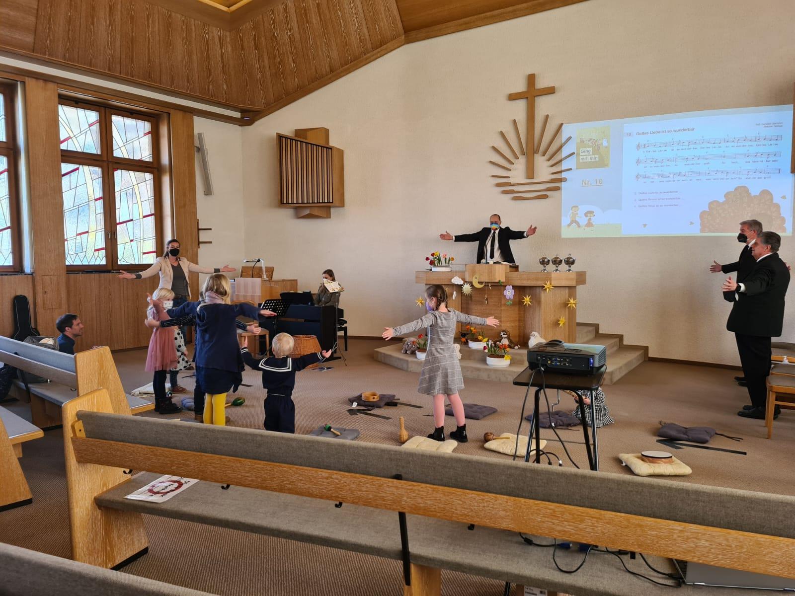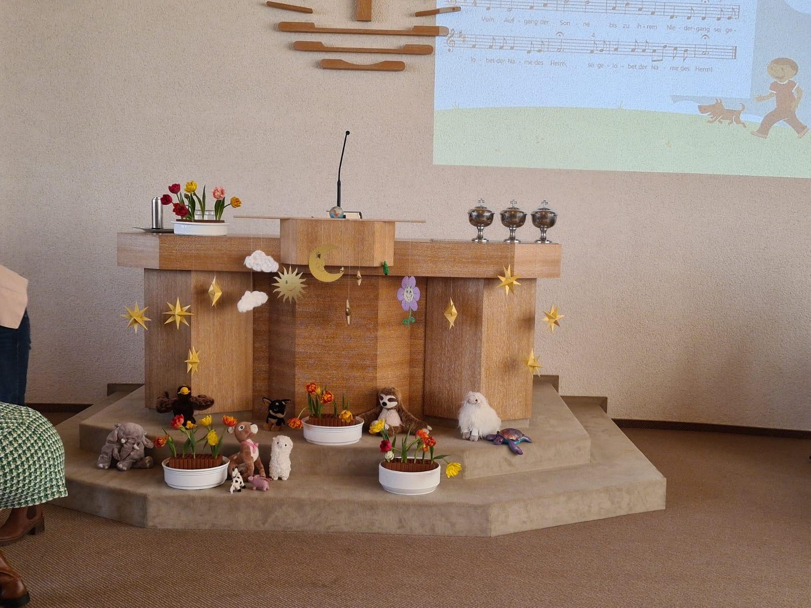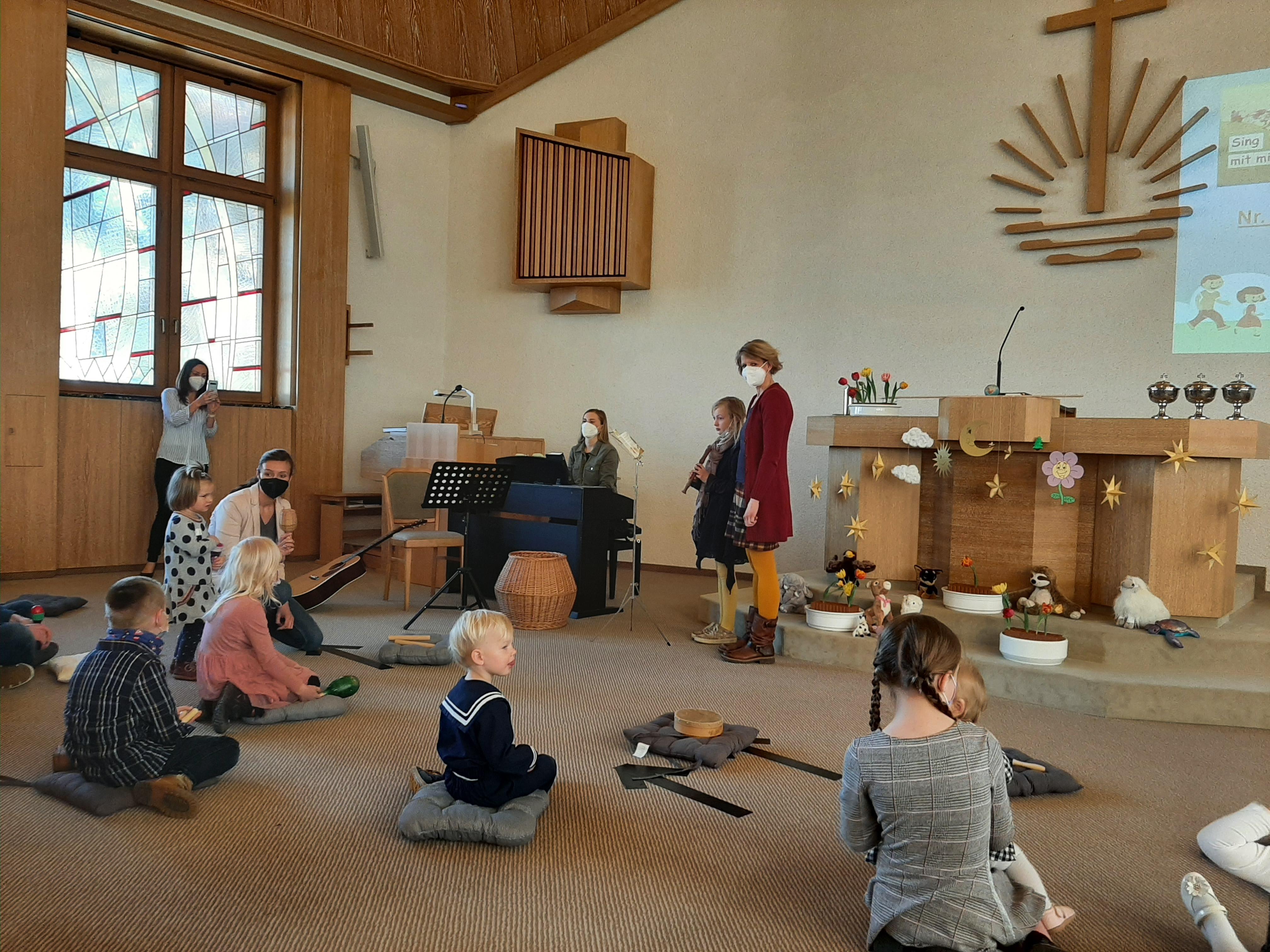 Das Thema „Schöpfung“ zog sich durch den Gottesdienst. Die Kinder sangen schwungvolle Lieder, dabei wurden sie unterstützt von Klavier, Gitarre und Rhythmusinstrumenten.